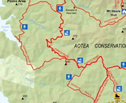 The track climbs steadily and follows the dividing ridge before veering right and dropping steeply to the valley floor and sign-posted junction (1 hour 30 minutes), leading to a 15-minute walk to the head of Kiwiriki Bay. The main track crosses Kiwiriki Stream and climbs through the valley and central ridge to meet Forest Road at Maungapiko (1 hour 30 minutes).