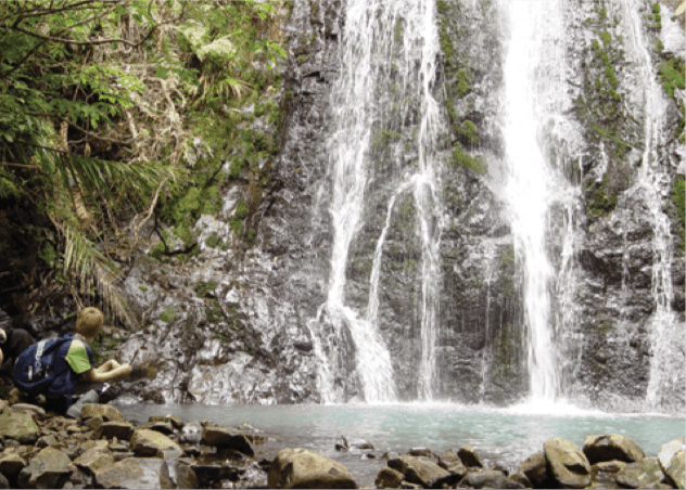 Warren’s Track is a gently graded climb to a waterfall. The stream offers deep pools good for swimming, continuing through to a Kauri plantation before joining Bridle Track, which leads to the Fitzroy store.