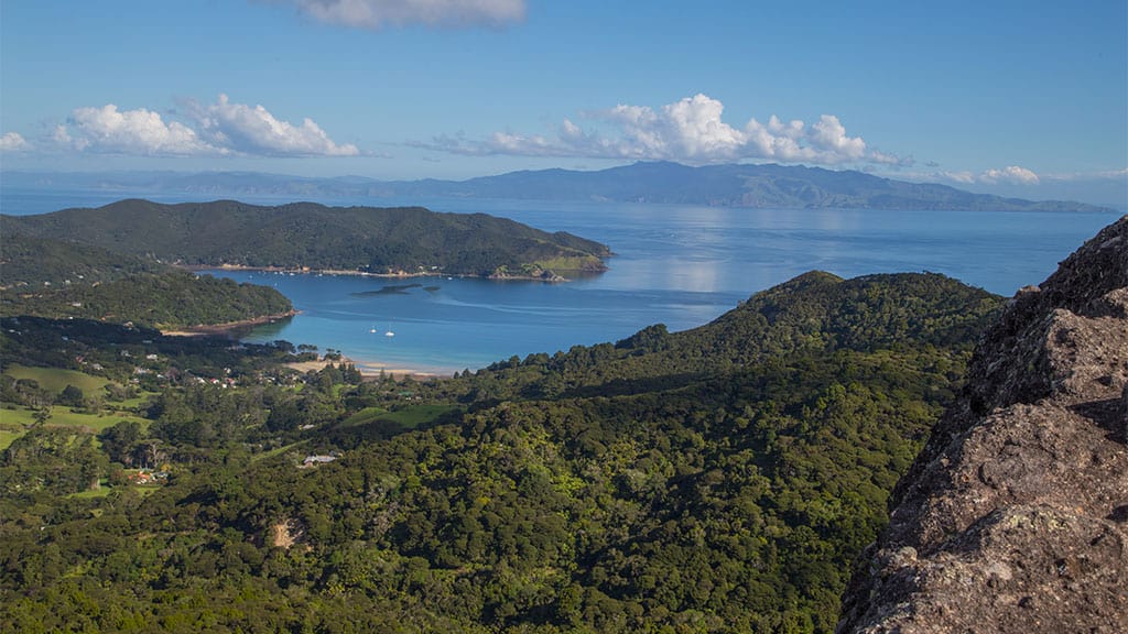 At the top, turn left to the lookout, where you can enjoy views south and west across Tryphena, as well as stunning views north and east across beaches of Medlands and Kaitoke.