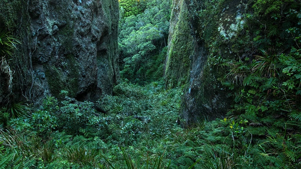 Windy Canyon is a popular walk on Great Barrier Island, offering spectacular views. The climb includes numerous steps through the sheer rock faces of Windy Canyon. There are splendid views of Okiwi Basin and Whangapoua Beach and estuary to the north, and Kaitoke and Medlands beaches to the east. You can then continue on Palmers Track to the summit of Hirakimata/Mt Hobson. This is the shortest and easiest of the three paths to the summit. Palmer’s Track continues to follow the ridge offering constantly changing vistas in every direction before climbing steeply to the summit, traversing steep inclines via an impressive system of steps and stairways. Healthy examples of the endemic plant prostrate kānuka can be seen among regenerating forest. On the ridge still stands the ‘wooden horse’, a sturdy H-frame used for winching logs from the eastern slopes up and over the saddle, before sending them plummeting down the other side on their way to the sea. Hirakimata/Mt Hobson is the site of several rare species. It is the favoured choice of the tomtit, black petrel and recently re-introduced North Island robin, and is frequented by kākāriki and kākā. The beautiful endemic Great Barrier tree daisy and tiny sun dews also like it here. The track begins at the top of Whangapoua Hill on Aotea Road.