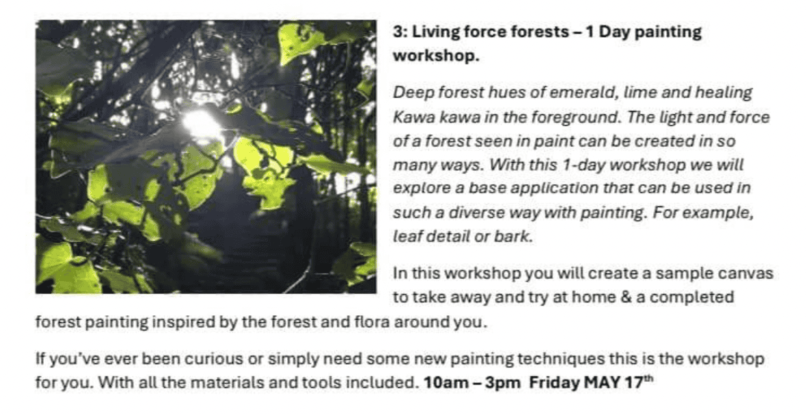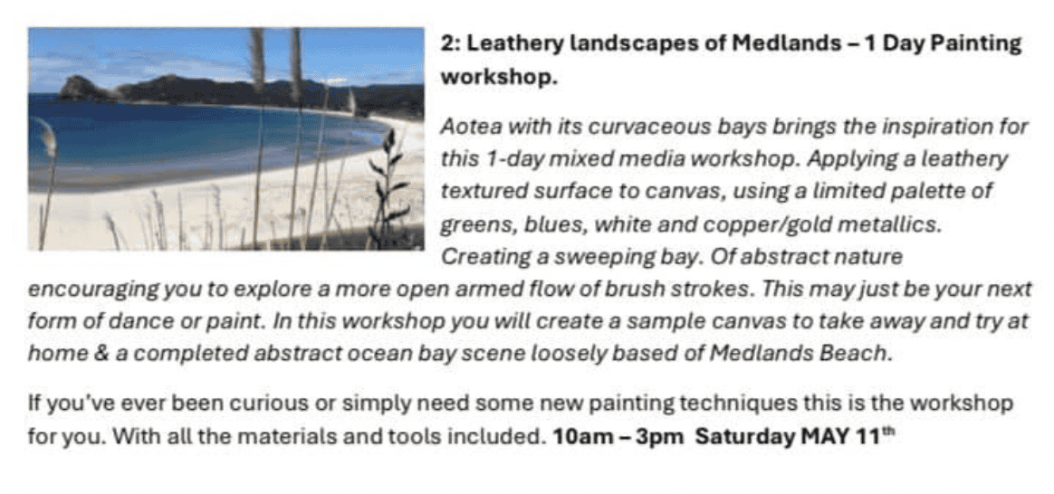 Aotea Arts & History Village 80 Hector Sanderson Road, ClarisAll Classes from 10am - 3pm at Claris Art Gallery $70 per person or 3 or more for $55 each Bookings and payments essential to hold your space Contact Helen at 027 740 5549 or email artyhelenknaggs@gmail.com for full programme … Read More