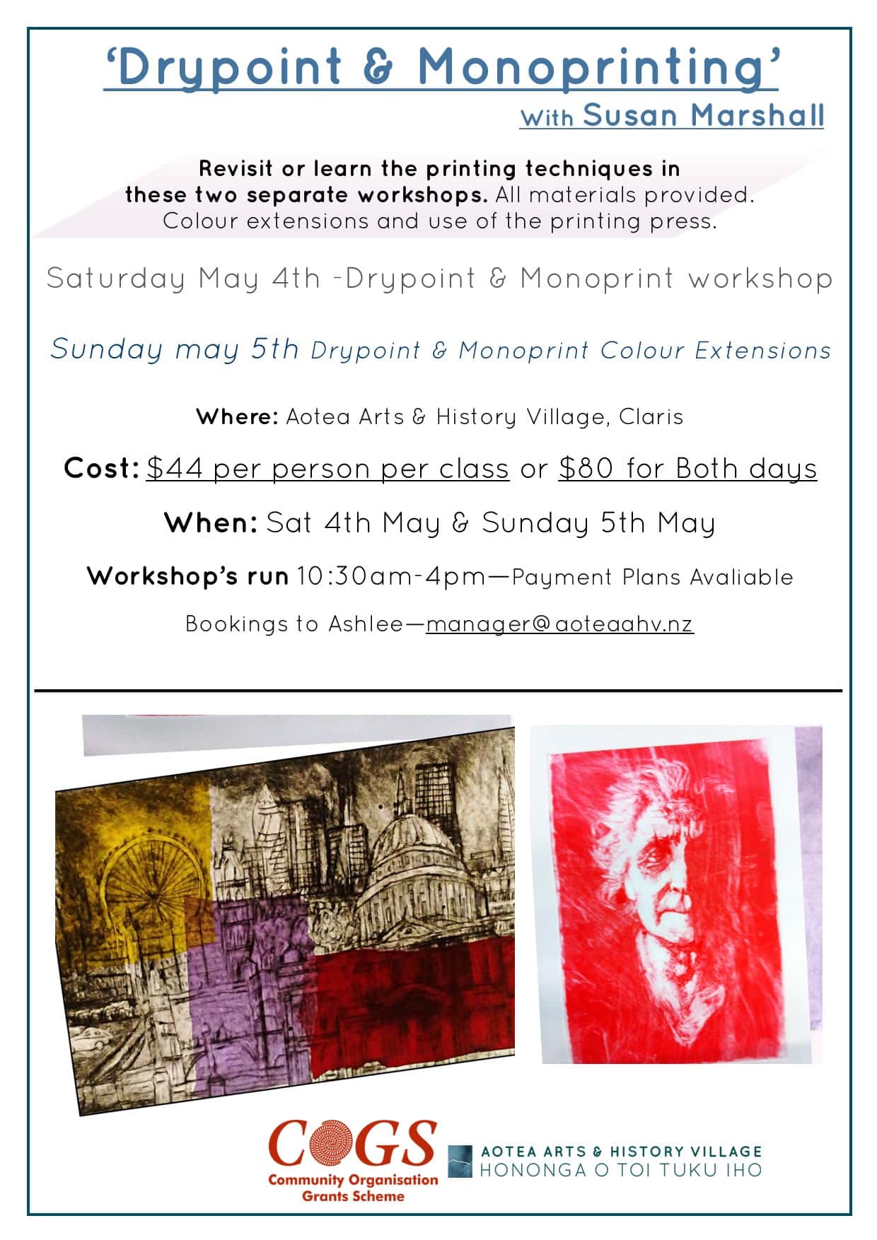 Revisit or learn the printing techniques in these two separate workshops. All materials provided Colour extensions and use of the printing press. Saturday May 4th-Drypoint & Monoprint workshop Sunday may 5th Drupoint & Monoprint Colour Extensions Where: Aotea Arts & … Read More