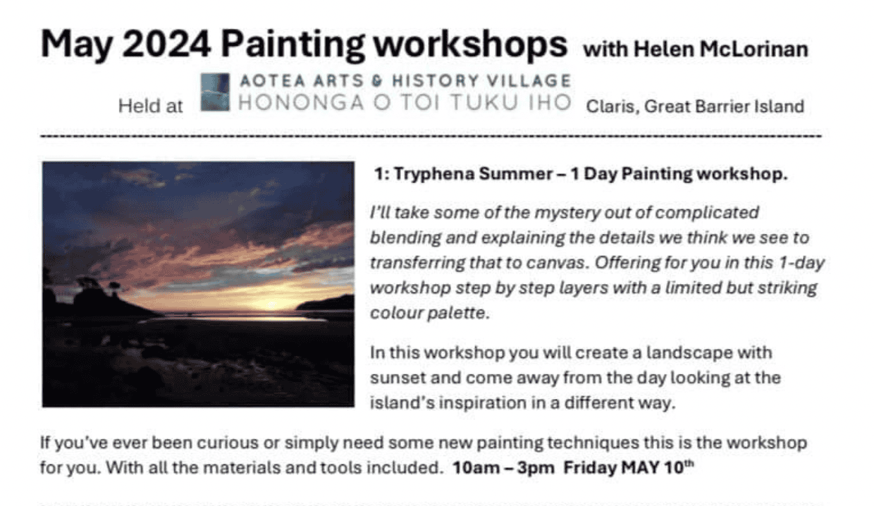 All Classes from 10am - 3pm at Claris Art Gallery $70 per person or 3 or more for $55 each Bookings and payments essential to hold your space Contact Helen at 027 740 5549 or email artyhelenknaggs@gmail.com for full programme … Read More