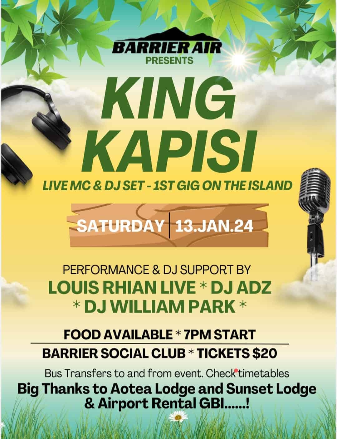 Well this is one you won't want to miss. The legend himself KING KAPISI LIVE AT Barrier Social Club JANUARY 13TH Thanks to Barrier Air presents. Also supported by airport rentals gbi, Aotea lodge and Stray possum lodge. 20 bucks … Read More
